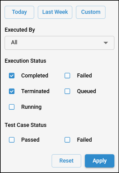 - You can use the filter options in Script Execution to refine results based on your needs. Select a time range such as Today, Last Week, or a Custom range. You can also filter by the user from the “Executed By” dropdown. Additionally, apply filters based on Execution Status, including Completed, Failed, Terminated, Queued, and Running. For more granular results, you can filter by Test Case Status, such as Passed or Failed. Use the Apply button to enforce filters or Reset to clear them.