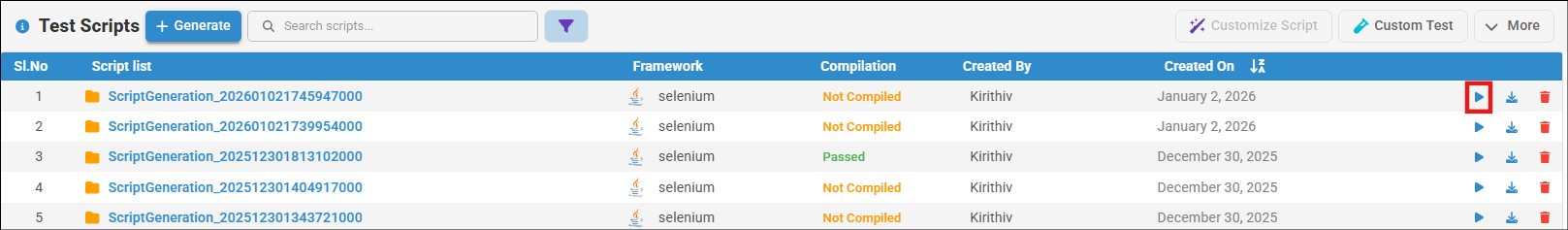 - Once the script has been generated, a play icon button will be available next to the script on the Test Scripts page. Click the icon to execute the script.
