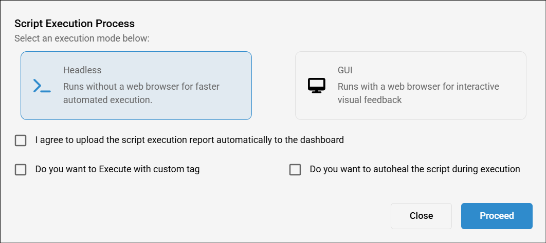 - Choose whether you want to execute the script in Headless mode or GUI mode. In Headless mode, the execution runs in the command prompt without displaying the execution UI. When GUI mode is selected then you can view the execution preview with command prompt and you can also view them in full screen and minimize back if you don't want to see in full screen.