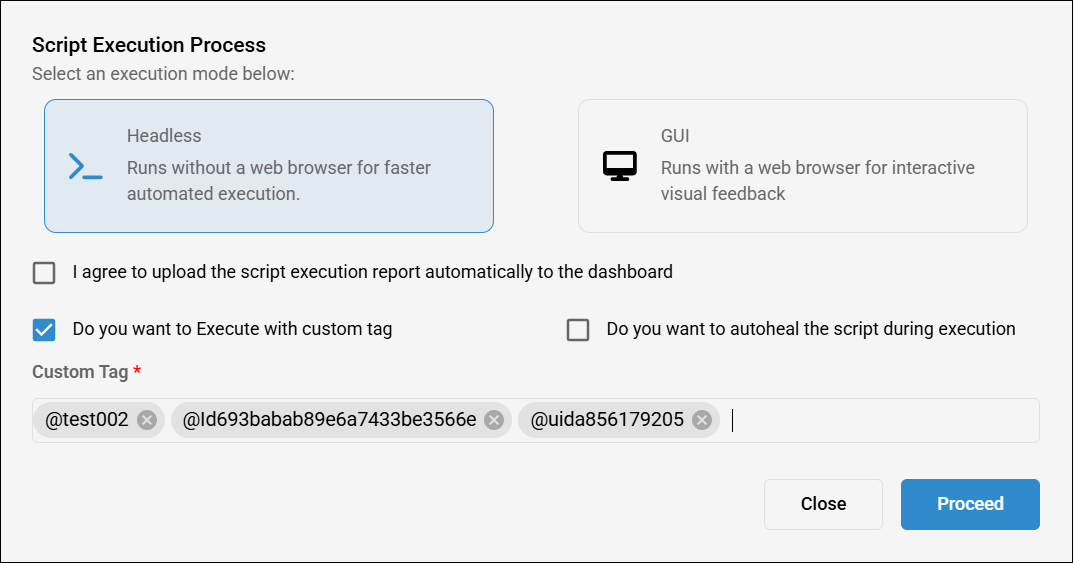 Note: The option to execute scripts using a custom tag is currently available only for the Java and Python Selenium frameworks. - If automatic autohealing is required during execution, enable the Do you want to autoheal the script during execution checkbox.