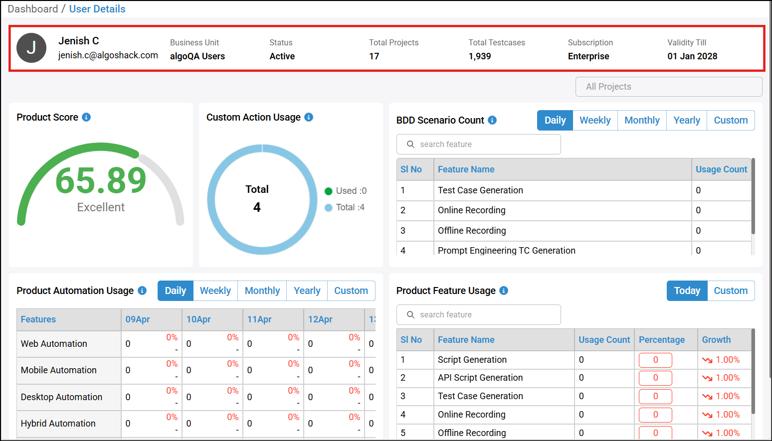 - At the top, you can view user details such as email ID, business unit, status, total projects, total test cases, subscription, and validity.