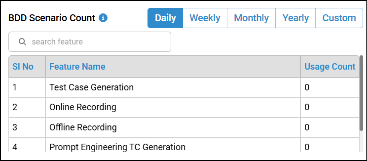 - Next is the BDD Scenario Count, where you can view a table showing the number of scenarios created by users using different methods such as online recording, offline recording, auto test case generation, prompt engineering, Jira issues to test case generation, and feature file to script conversion.
