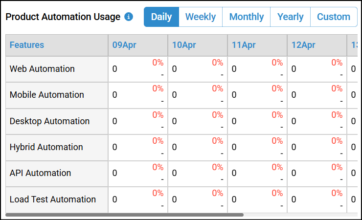 - Fourth is Product Automation Usage, where you can view the usage of each automation type. The usage percentage increases as projects are created across different automation types.