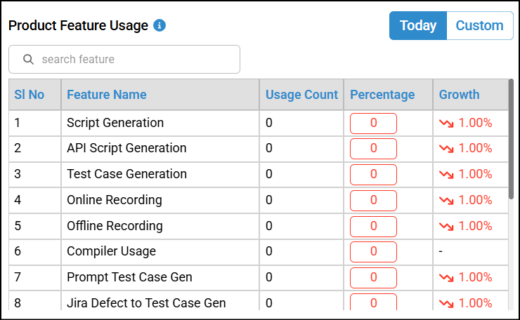 - Fifth is Product Feature Usage, where you can view the usage of each feature. The table displays both the usage count and the percentage of usage. You can also filter the data by Today or a custom time range.