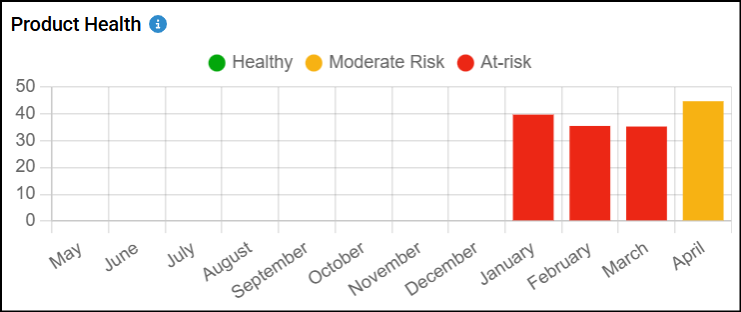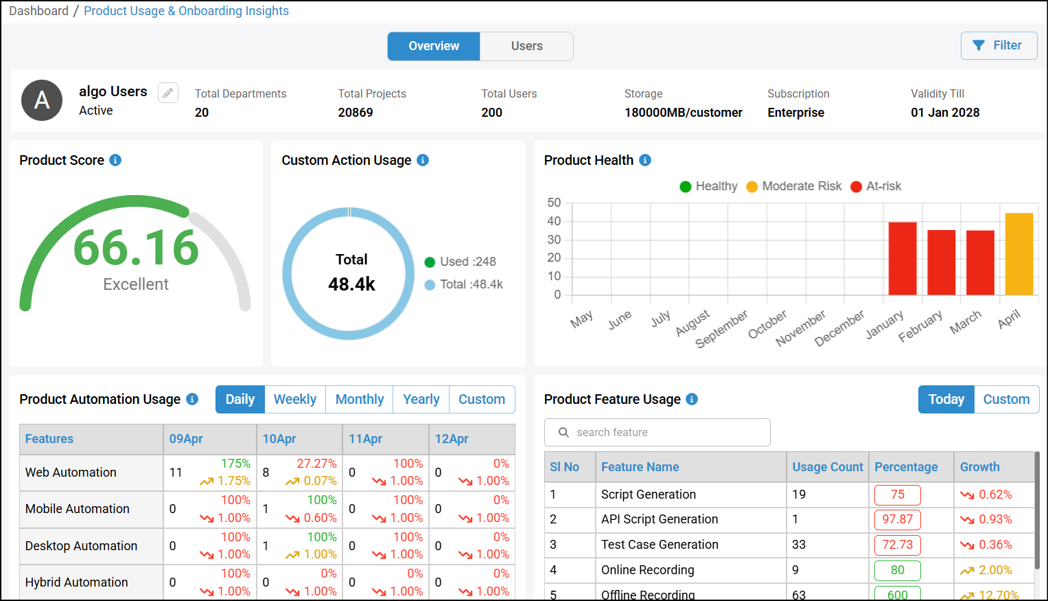 - Next is the Product Health Graph, where you can view the health of product usage for each month based on user activity. This section provides insights into the overall health and performance of the product, helping you identify areas for improvement and ensure an optimal user experience.