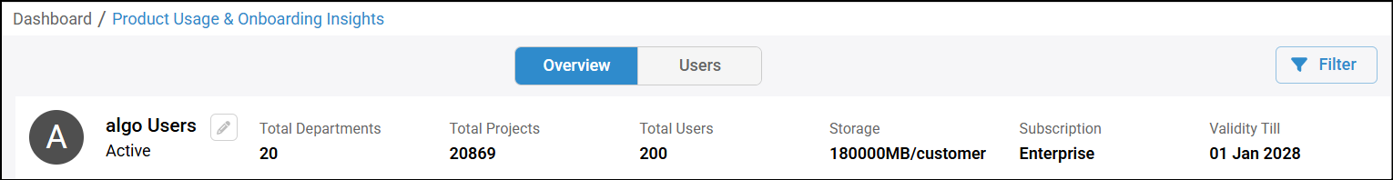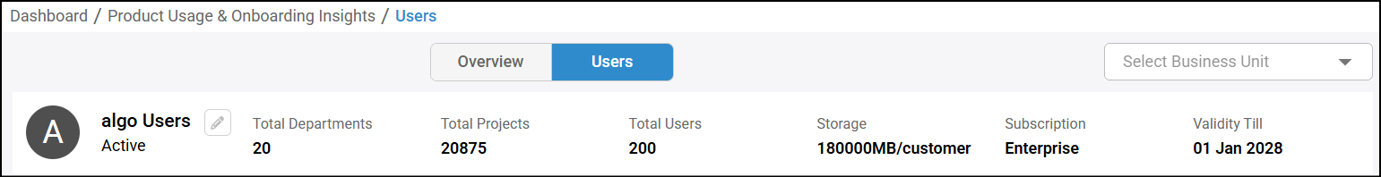 - In users tab at top you can view key details such as total departments, total projects, total users, storage, subscription type, and validity. You can also filter by business unit. You can also edit the customer name by clicking the Edit icon next to it.