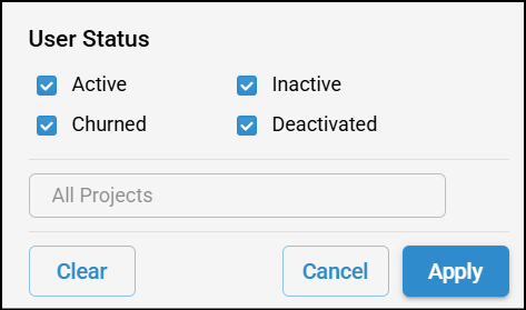 - A filter is available that allows you to refine results by selecting or unselecting the checkboxes for Active, Inactive, Churned, and Deactivated users. You can also filter by Project and then click Apply to view the results.