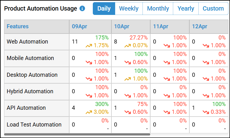 - Product Automation Usage allows you to view how your users are utilizing each automation type. The usage percentage increases as projects are created across different automation types. You can filter the data by daily, weekly, monthly, or custom time ranges. This section provides insights into user interactions with the product, highlighting key usage metrics and trends to help optimize user engagement and overall satisfaction.