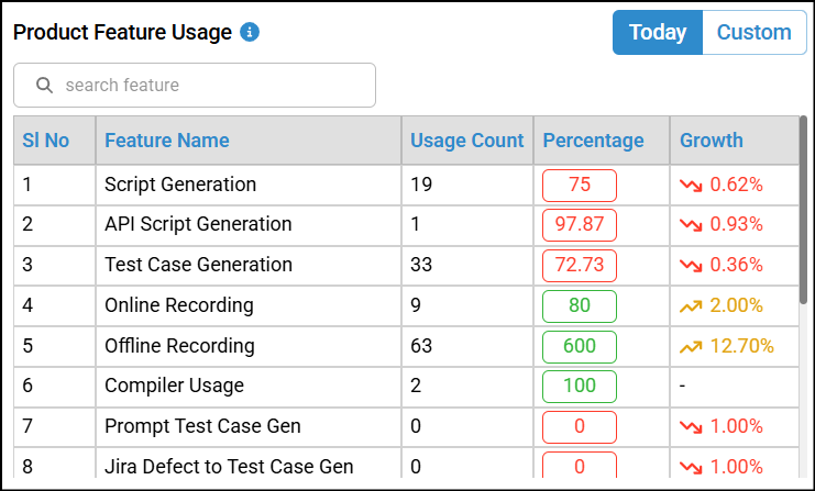 - Product Feature Usage allows you to view how your users are utilizing each feature. The table displays both the usage count and the percentage of usage. You can also filter the data by Today or a custom time range.