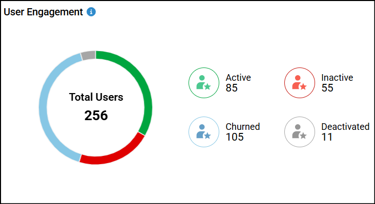 - User Engagement shows the total number of users, along with a breakdown of Active, Inactive, Churned, and Deactivated users.