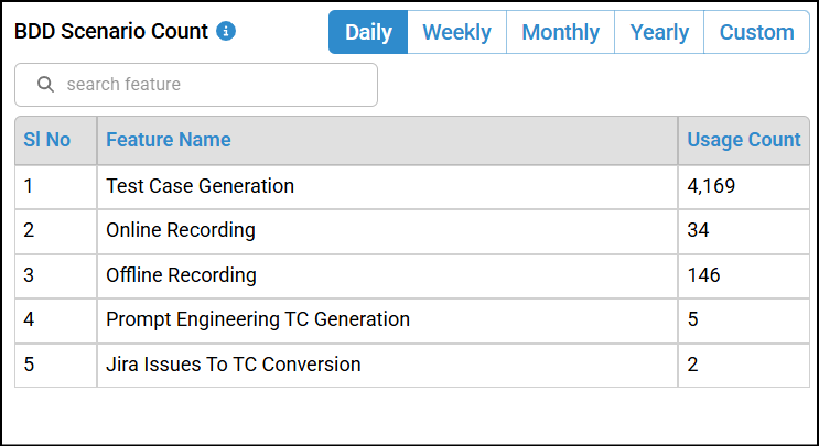 - BDD Scenario Count allows you to view a table showing the number of scenarios created by your users using different methods such as online recording, offline recording, auto test case generation, prompt engineering, Jira issues to test case generation, and feature file to script conversion. You can also filter the data by daily, weekly, monthly, yearly, or custom time ranges.