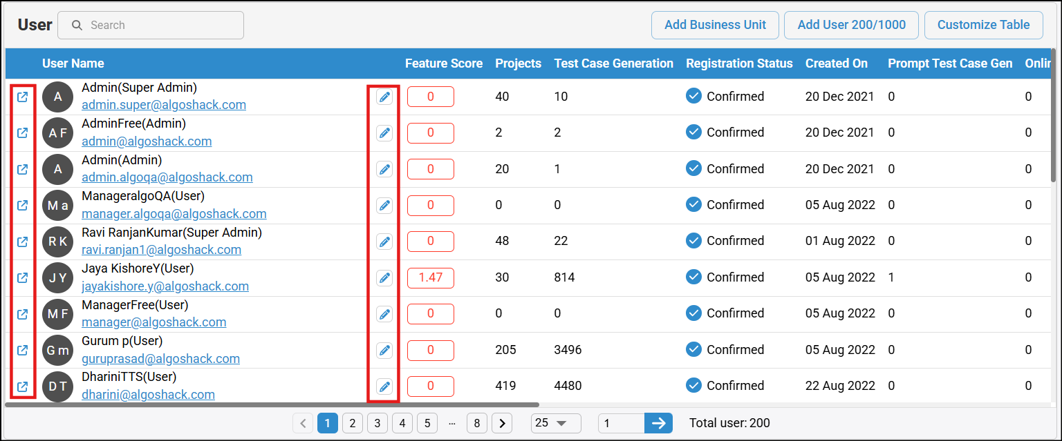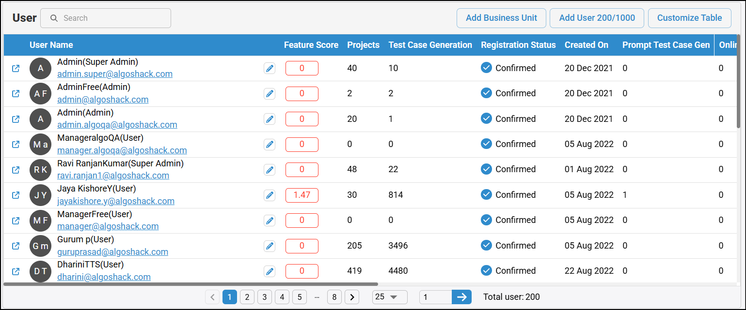 - You can view all users under this admin in the table. It includes details such as feature score, number of projects created, number of test cases generated, user registration status, created date, feature usage count, user status, and last active time.