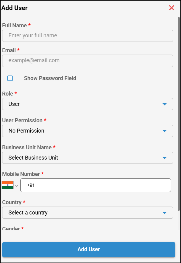 - You can also add users by clicking on Add User (200/100). Enter the required details such as name, email ID, role, user permissions, business unit, mobile number, country, and gender, then click Add User.