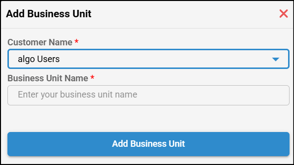 - You can add a business unit by clicking on Add Business Unit. Select the customer name, enter the business unit name, and then click Add Business Unit.